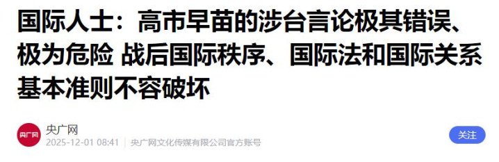 [2]国际人士:高市早苗的涉台言论极其错误、极为危险 战后国际秩序、国际法和国际关系基本准则不容破坏 央广网