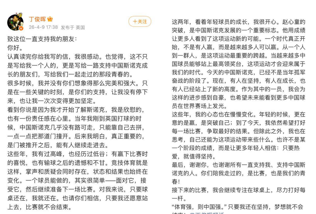 在长文中,丁俊晖向支持他的球迷表达了衷心的感谢。他分享道,自己在职业生涯中经历过辉煌与低谷,体会到掌声与质疑的共存。同时,他称赞了年轻球员赵心童的表现,表示看到其成长颇感欣慰。他指出,“赵心童的突破,标志着中国斯诺克的重要发展,他用实际成绩展现了这项运动的新希望。”